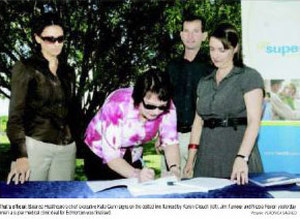 "That's official: Balance Healthcare's chief executive Kate Gunn signs on the dotted line flanked by Karen Crouch (left), Jim Turnour and Nicola Roxon yesterday when a super medical clinic deal for Edmonton was finalised."
